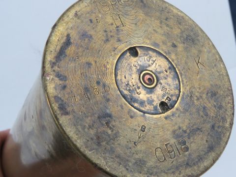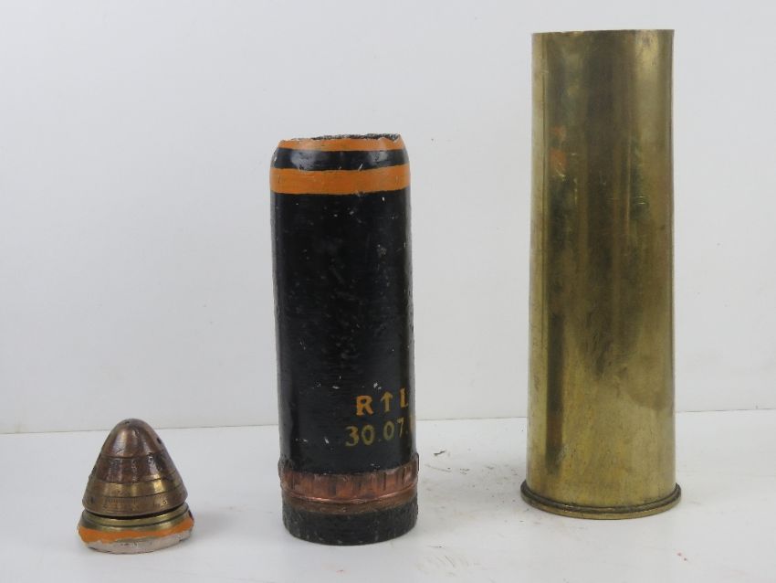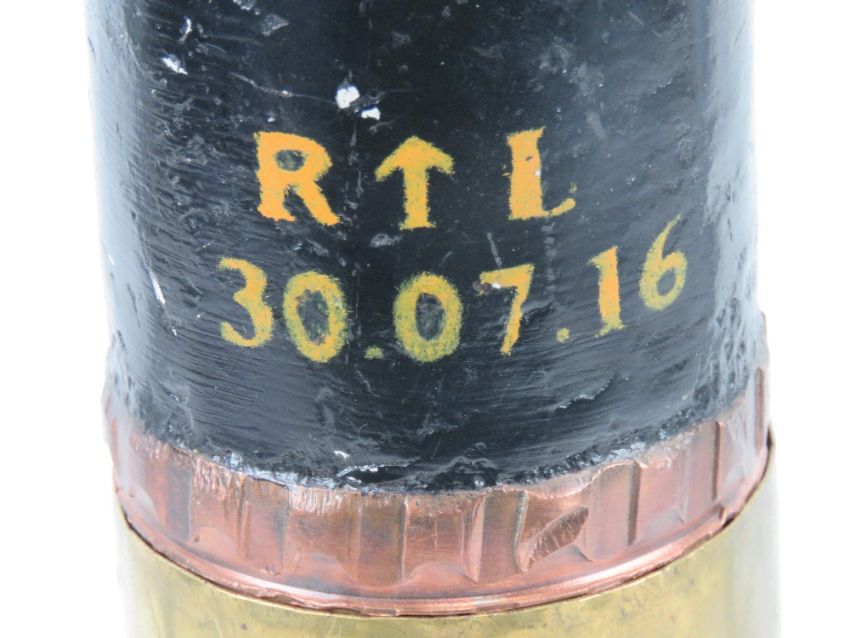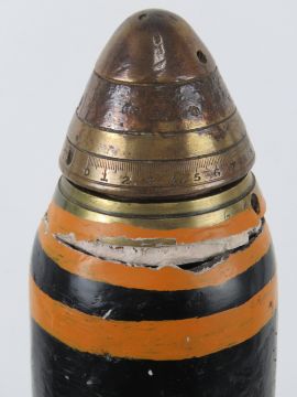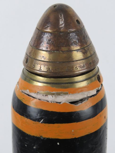 An inert WWI British shell dated 1918 with head and fuse, 58cm high.