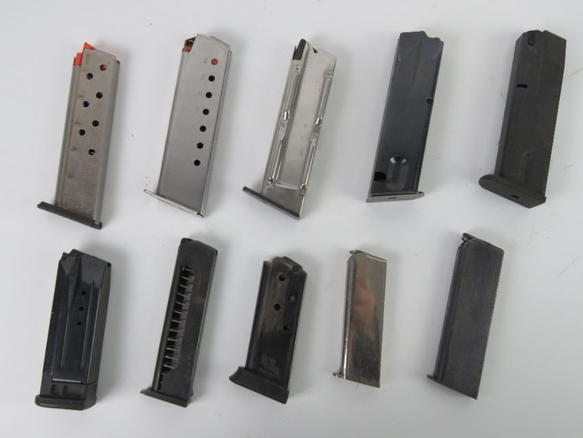 A quantity of ten assorted pistol magazines inc two marked for Smith & Wesson.