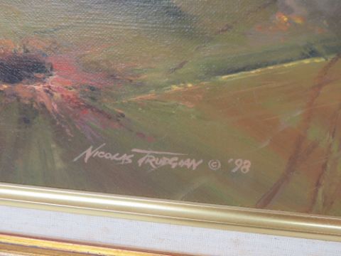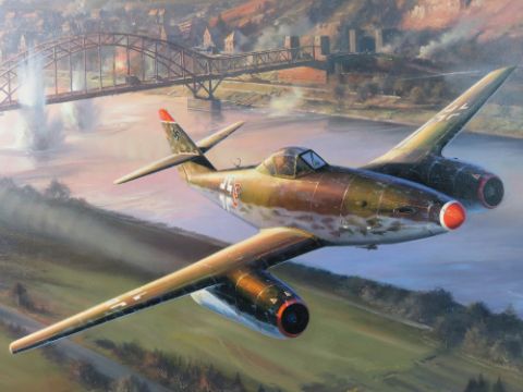 Oil on canvas, Nicholas Trudgian, 'Clash Over Remagen' Luftwaffe and RAF fighting over the river with mountains beyond, signed lower left, signed and entitled verso, further signatures verso Hurmann Wieczorek, Rony Lauer, Georg Csurusky and three others, picture measuring 106 x 59.5cm, framed.