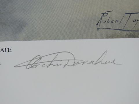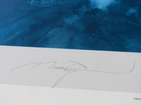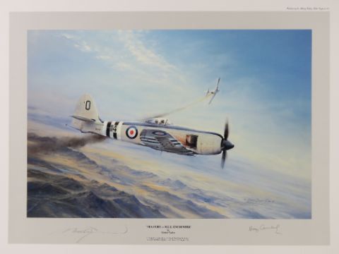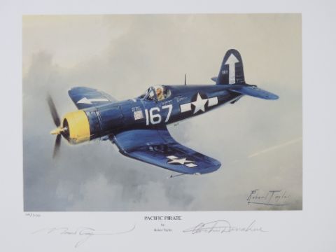 Robert Taylor, a small limited edition signed print 'Pacific Pirate' 14/300, signed by the artist and (Archie Donoghue?) picture size 27.5 x 19.5cm, together with two medium signed prints 'Sea Fury', signed by the artist and further signed by Lieutenant' Hoagy Carmichael, and 'Lancaster', signed by the artist and further signed by Group Captain Leonard Cheshire VC DSO DFC. Three items.