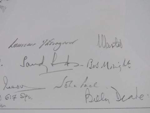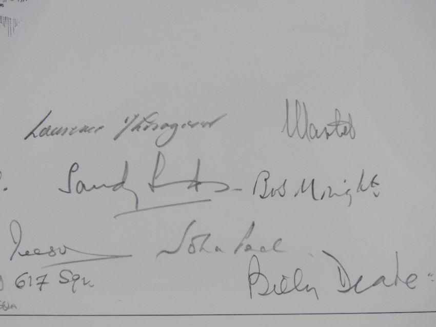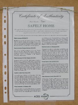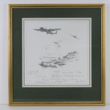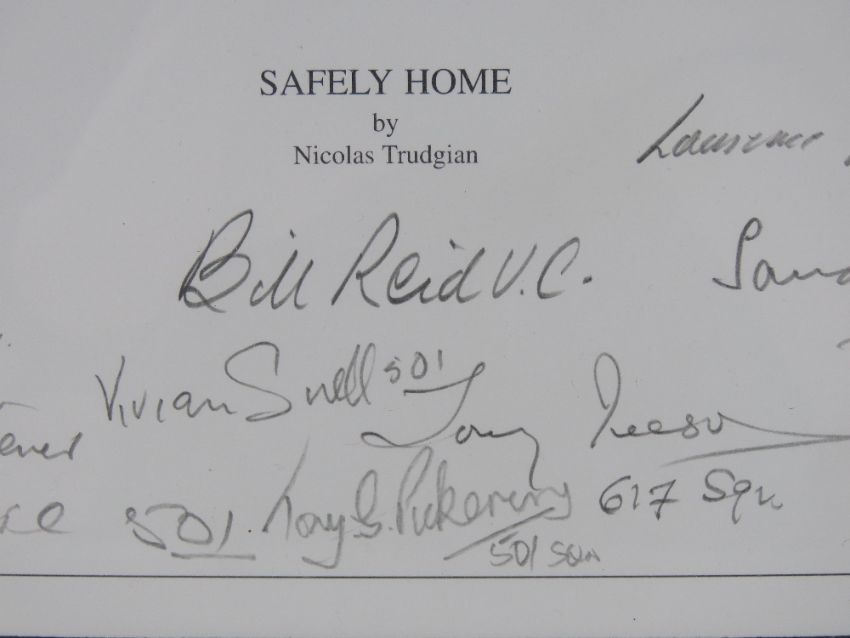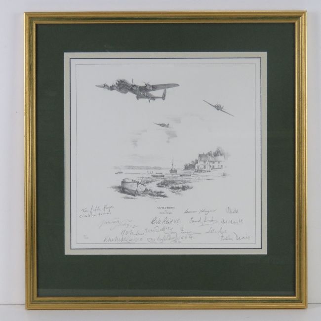 Nicholas Trudgian, signed limited edition print, 'Safely Home', 9/300, signed by the artist and further signed by Flight Lieutenant Bill Reid VC, Squadron Leader Norman Scrivener, DSO DSC, Flight Lieutenant RE 'Bob' Knights DSO DFC, Squadron Leader Tony Iveson DFC, Wing Commander J G Sanders DFC, Squadron Leader L A Thorogood DFC, Group Captain John Peel DSO DFC, FLight Lieutenant Ludwik Martel Kw Vn and others, measuring 32 x 32cm, framed and mounted, frame measuring 50.5 x 53cm. With cert.