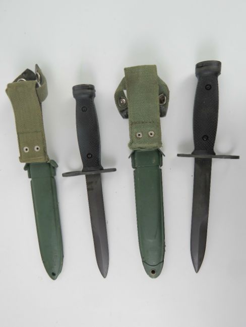 Two M16 bayonets with scabbards and canvas frogs.