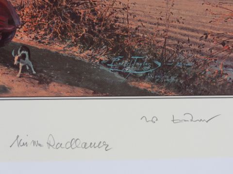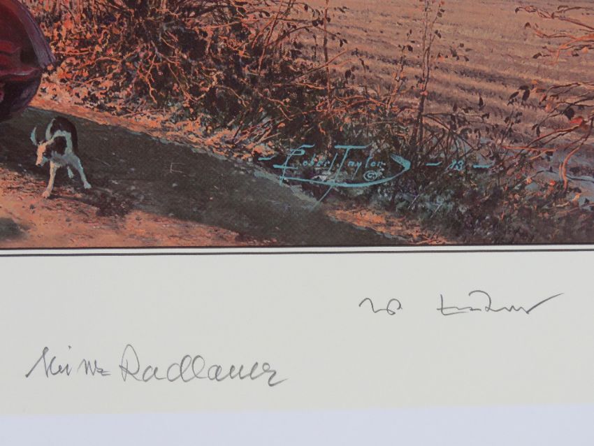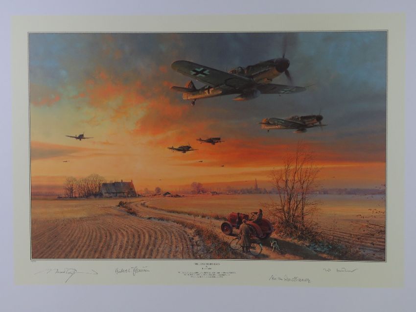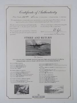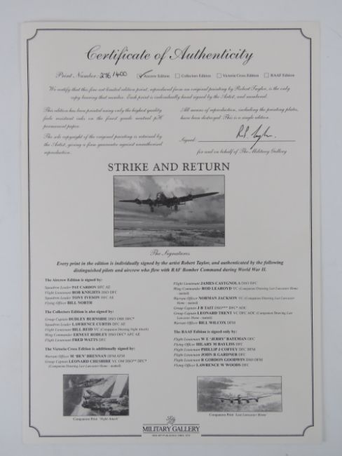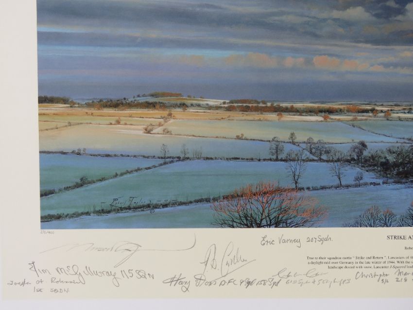 Robert Taylor, profusely signed limited edition print 'Strike and Return', 276/400, signed by the artist and further signed by Squadron Leader Pat Cardon DFC AE, Flight Lieutenant Bob Knights DSo DFC, Squadron leader Tony Iveson DFC AE, Flying Officer Bill North and others, approx twenty signatures in total, picture measuring 61 x 40.5cm. With cert. Together with a signed limited edition Robert Taylor print 'The Long Short Days', 12/250, signed by the artist and three others, picture measuring 65.5 x 42cm. Two items.