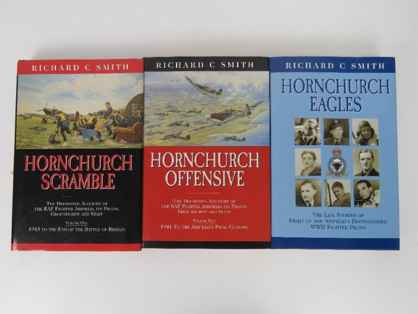 Three Hornchurch themed books by Richard C Smith, two being signed by the author with various other signatures, respectively entitled Hornchurch Scramble, Hornchurch Offensive, and Hornchurch Eagles.