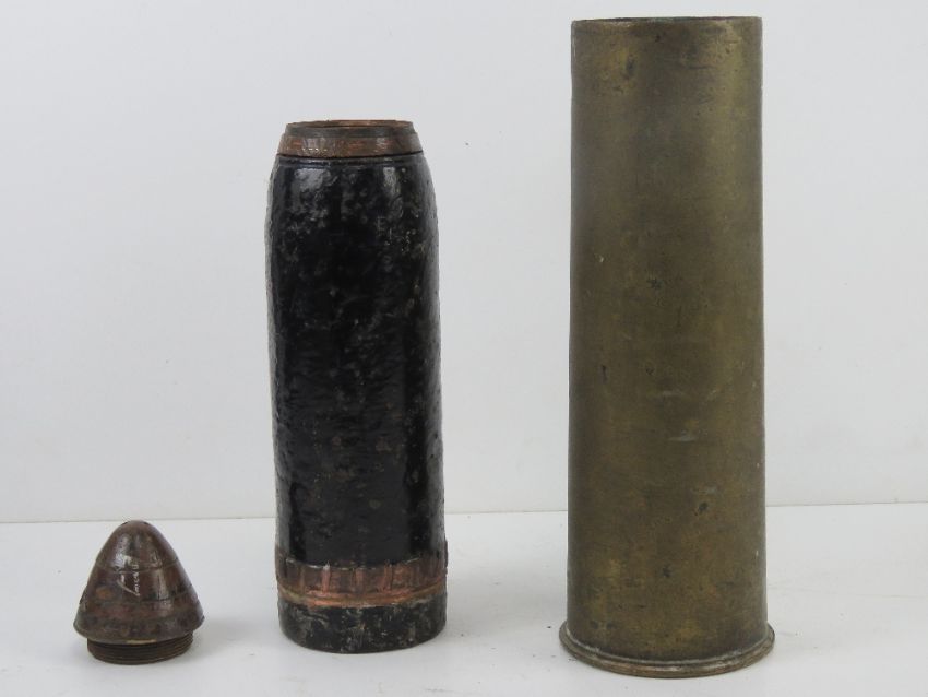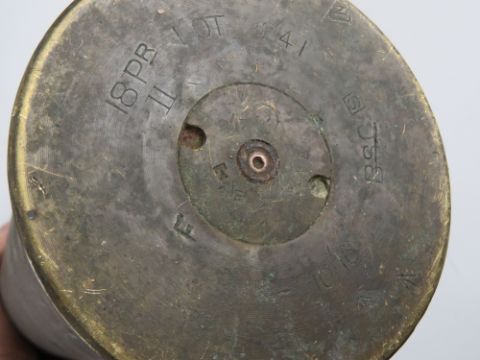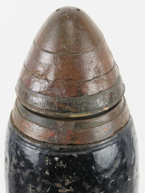 An inert WWI British 18lb artillery shrapnel shell, with timer fuse and case dated 1916, 57cm high.