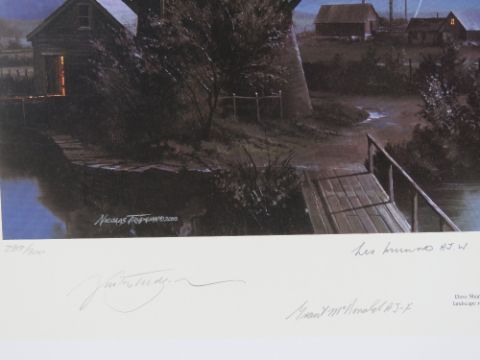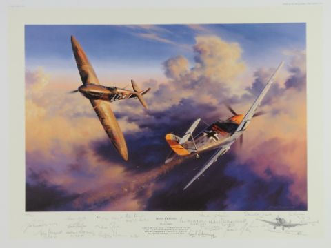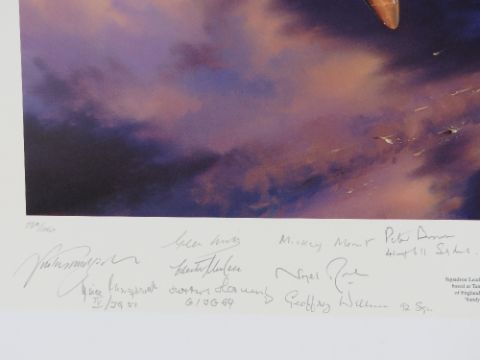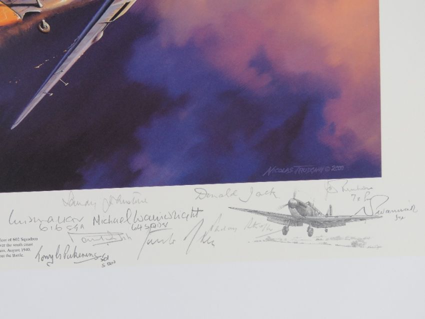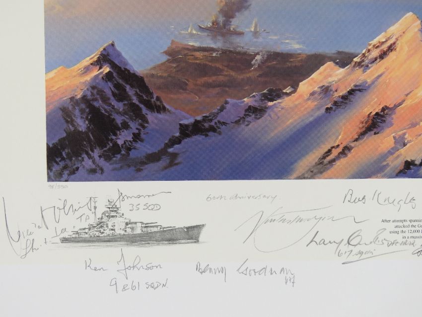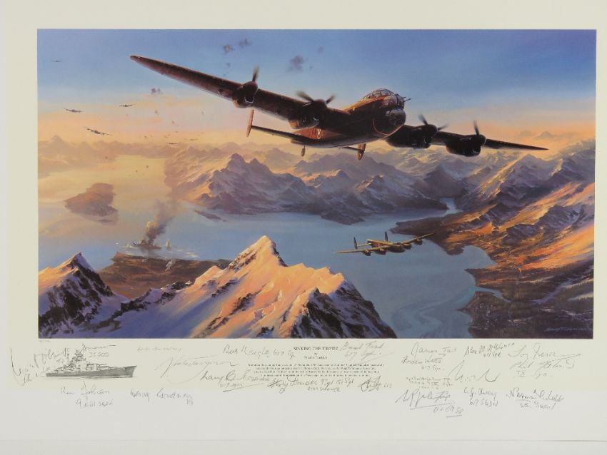 Nicholas Trudgian, three profusely signed limited edition prints, each with certificate; 'Sinking the Tirpitz', 98/550, signed by the artist and further signed by Group Captain J B Tait, Squadron Leader Tony Iveson, Lieutenant Zur See Willibald Volsing and others (approx twenty signatures), picture measuring 54 x 30cm, 'Homeward Bound', 289/300, signed by the artist and further signed Sergeant Ray Grayston, Flight Lieutenant Edward Johnson DFC and others, picture measuring 52 x 30cm, 'Head to Head', 239/450, signed by the artist and further signed by Air Vice Marshall Sandy Johnstone, Wing Commander Paddy Barthrop, Air Commodor CJ Mickey Mount, Squadron Leader Nigel Rose, Air Commodor Paul Webb, Wing Commander Hector MacLan, Flying Officer Hugh Niven and Wing Commander Donald M Jack, picture measuring 51 x 34cm.