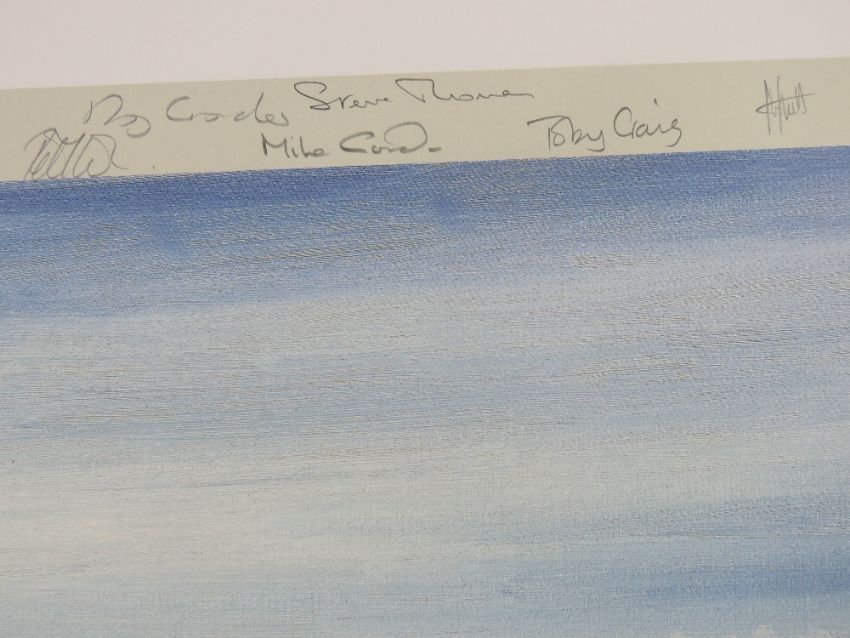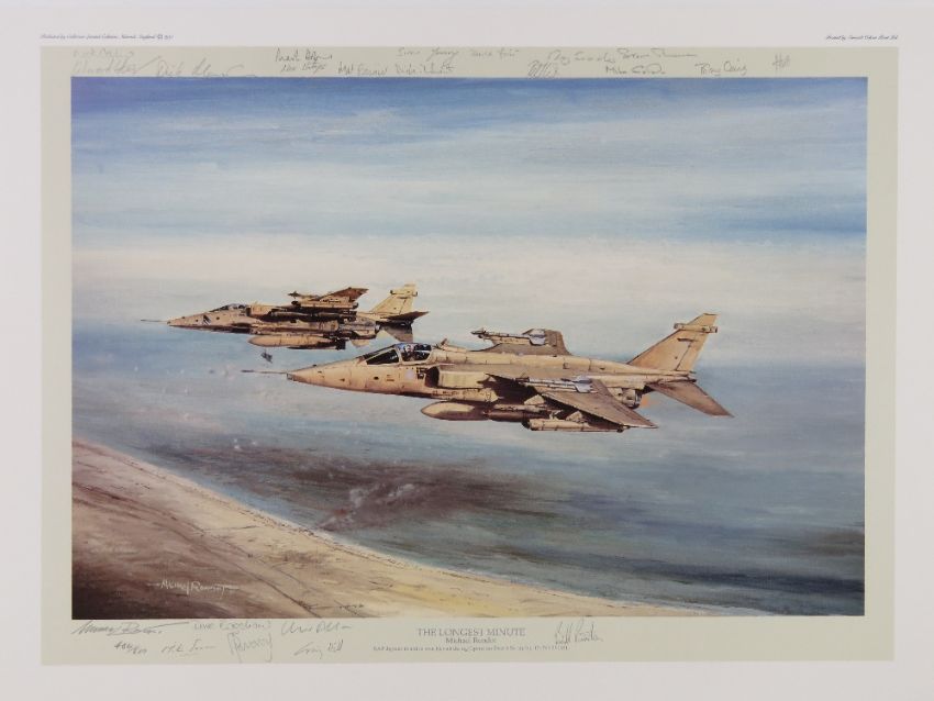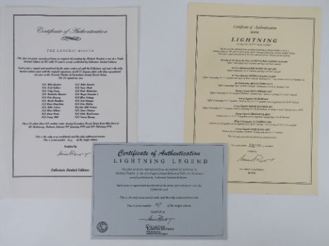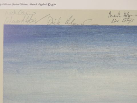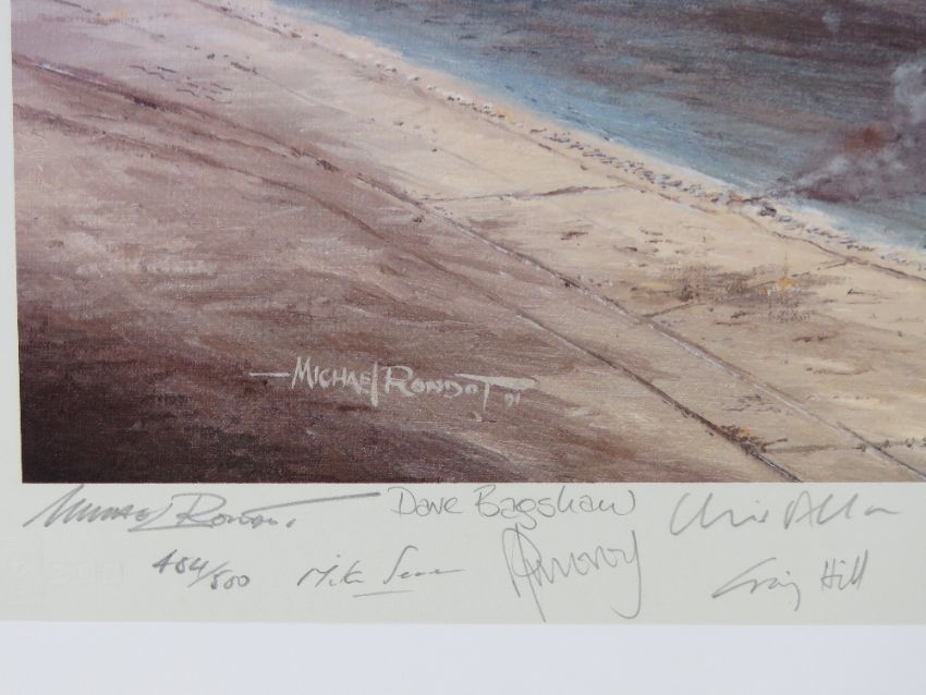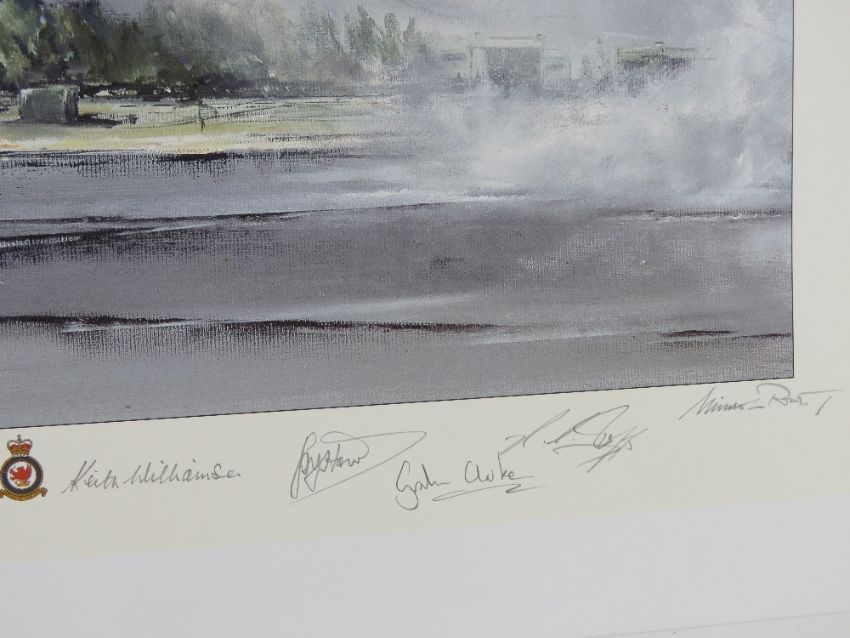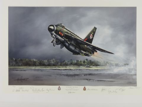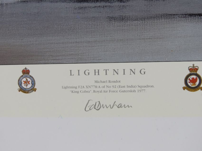 Michael Rondot, three signed limited edition prints, each with certificate; 'Lightening', 276/300, signed by the artist and having nine further signatures upon, picture measuring 61 x 37.5cm, 'Lightening Legend', 187/650, signed by the artist and further signed by Roland Beaumont CBE DSO DFC DL FRAeS, Jimmy Dell OBE and Johnny Squier, picture measuring 55.5 x 36.5cm, and 'The Longest Minute' 484/500, signed by the artist and having twenty-one further signatures upon, 52.5 x 36cm.