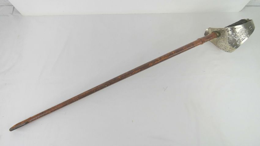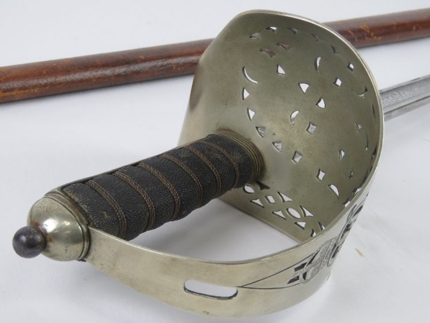A George V army cutlass made by Fenton Bros Sheffield 'Sword Cutlers to the War Office', having pattern to both sides of blade with GR cypher to both sides of blade and guard, blade measuring 83cm in length, having leather scabbard.