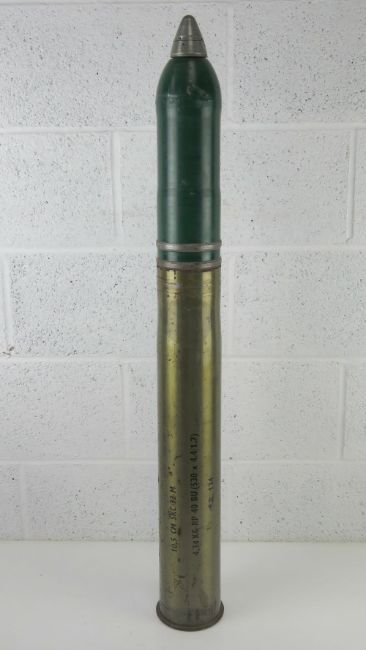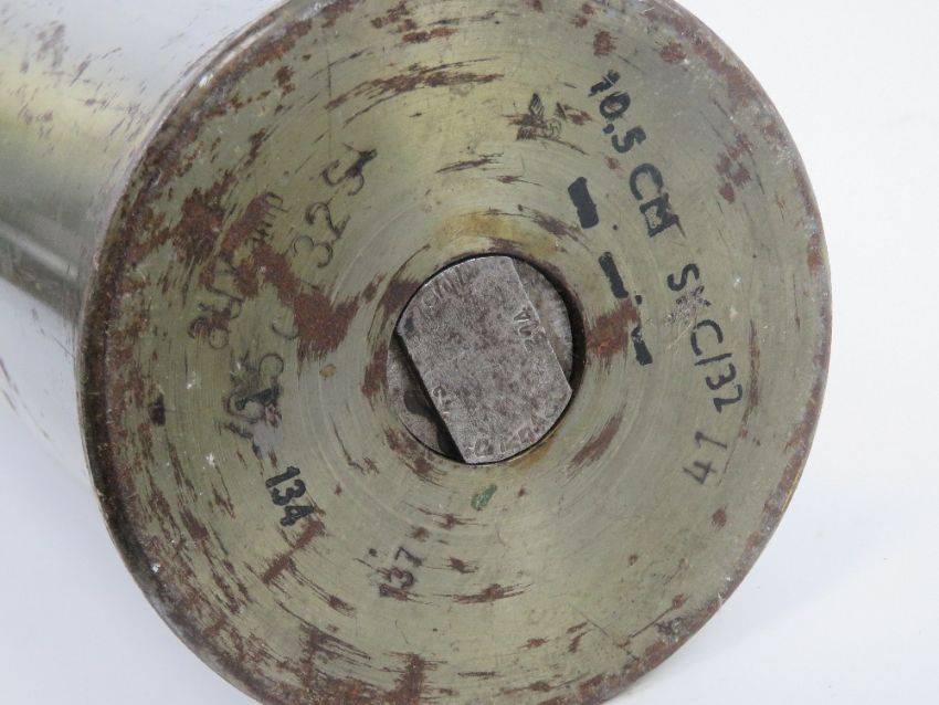 An inert WWII German 10.5cm Illumination shell dated 1941 with a German stamp to the shell, fuze (dated 1944) and round. 105cm high.