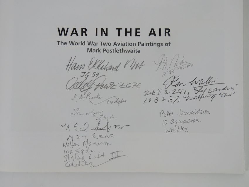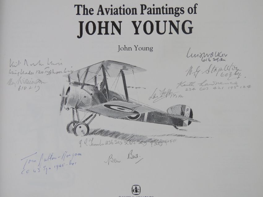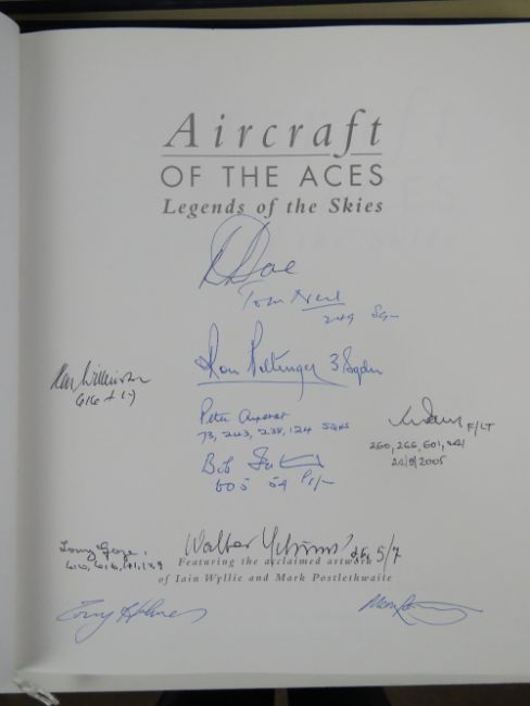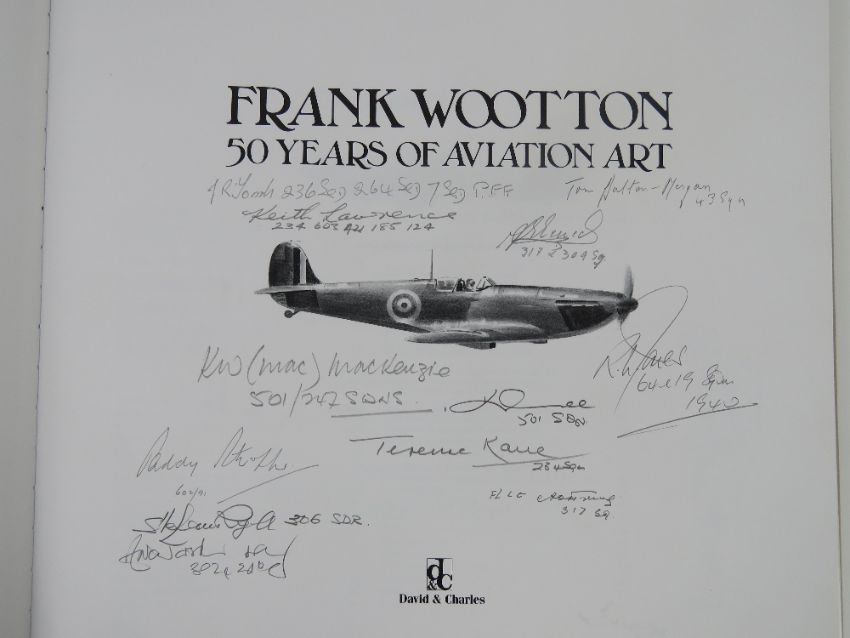 Four art books each having signatures to the frontice piece including 'Aircraft of the Aces, Legends of the Skies....Artwork of Iain Wyllie and Mark Postlethwaite' signed by Wing Commander Tom Neil, WIng Commander Bob Doe, Wing Commander Peter Ayerst, Wing Commander Bob Foster, Pilot Officer Ron Pottinger, further signed by the author and by Postlethwaite, 'War in the Air' paintings of Mark Postlethwaite, having approx ten signatures within, 'The Aviation paintings of John Young having nine signatures within, and 'Frank Wootton Fifty Years of Aviation Art' having eleven signatures within.