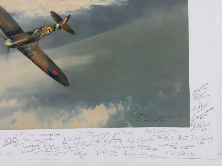 Robert Taylor, profusely signed limited edition print, 'After the Storm', 4/300, signed by the artist, further signed by Dame Vera Lynn, Squadron Leader 'Stapme' Stapleton, Flight Lieutenant Richard Jones, Wing Commander Ken Mackenzie, Wing Commander Jack Rose, Warrant Officer Peter Fox, Flight Lieutenant Eric Parkin, Squadron Leader Joclyn Millard, Flight Lieutenant Jack Toombs, Squadron Leader Tony Pickers, Wing Commander Vivian Snell, etc (approx 47 signatures in total). Picture measuring 55 x 39cm. With cert.