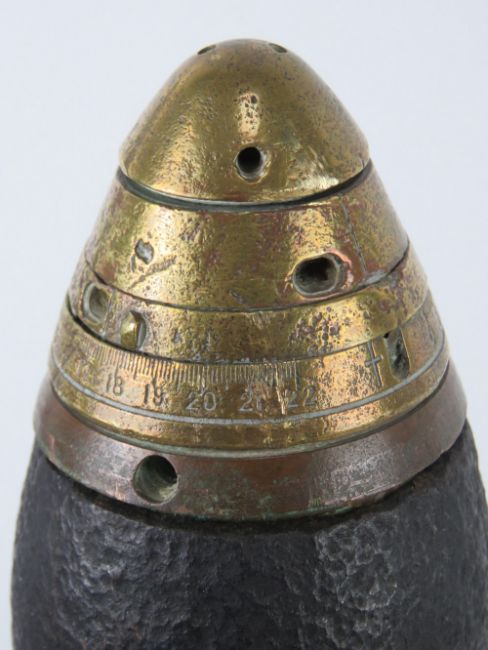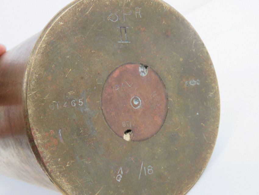 An inert WWI 18lb artillery shell, dated 1918 and marked, measuring 58cm high.