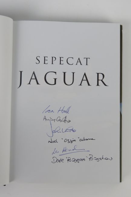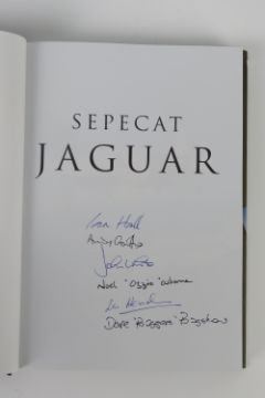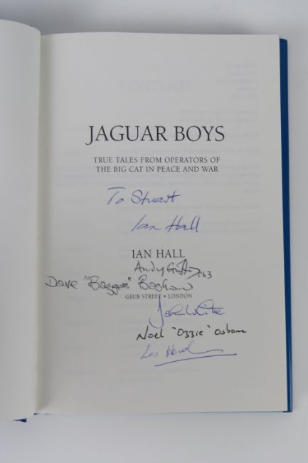 Sepecat Jaguar; three signed books on the Jaguar fighter jet, entitled 'Tactical Support and Maritime Strike Fighter', 'Endangered Species' and 'Jaguar Boys'. SIgnatures include Ian Hall, Andy Griffiths, John White, Noel 'Ozzie' Osborne, Dave 'Baggers' Bagshaw and others.
