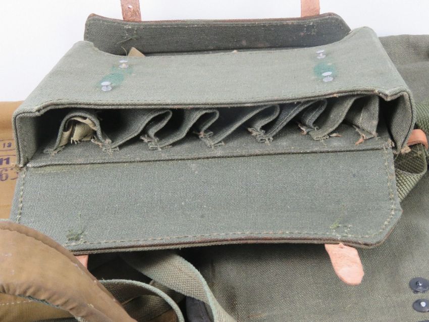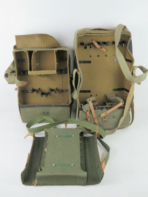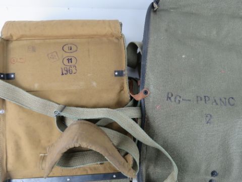 Three military canvas bags with leather fastenings; RPG2, RPG-7 and a Pallad bag.