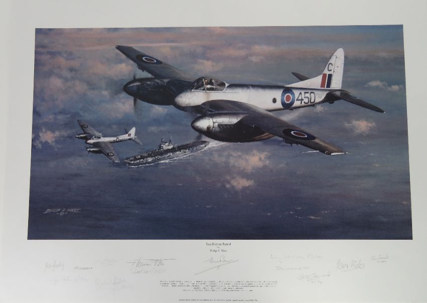 Philip E. West signed print, 'Sea Hornet Patrol', signed Eric Brown, Richard Griffiths, Andy Whitson, J H S Greenwood and eight others, picture measuring 62 x 35.5cm. Together with a print of 'Target Heading' by Simon Atack. Two items.