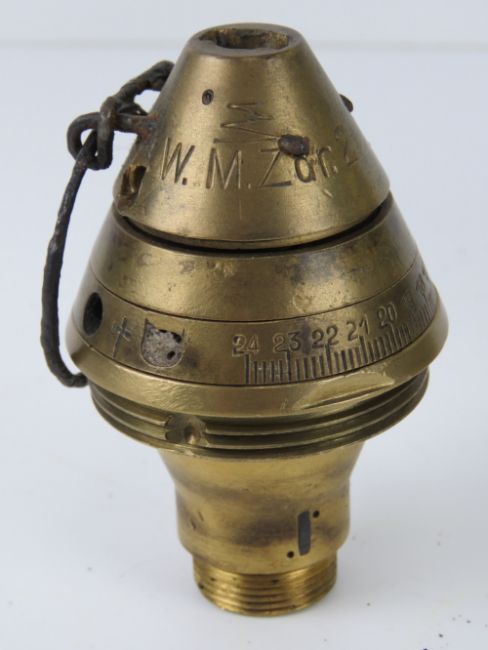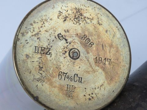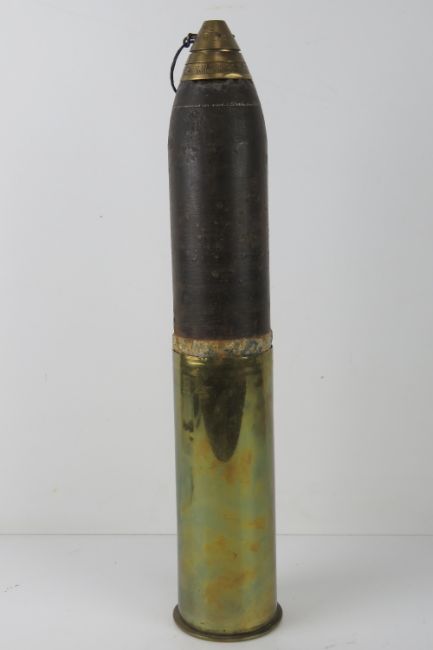 An inert WWI Minewaffer 75mm shell, dated 1917 on casing with fuse also dated 1917. 47cm in length.