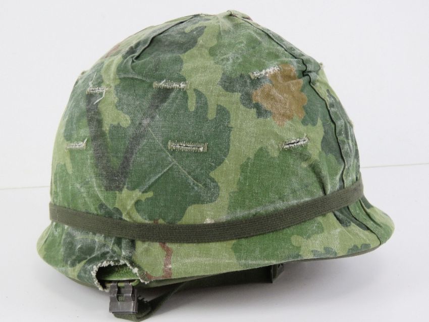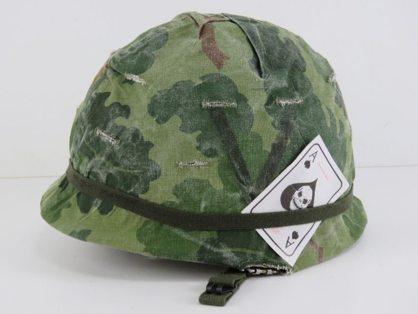 A US 5th Cavalry Vietnam era helmet with V air markings upon.