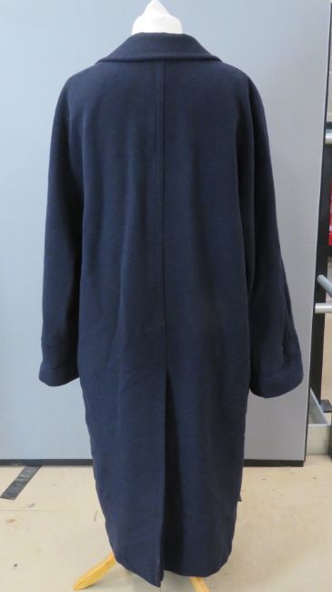 A navy blue wool blend 1980s coat, label removed. Approx measurements; 48" chest, 47 1/2" length at back inc collar, 19" to 22" arm length.