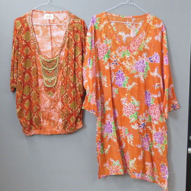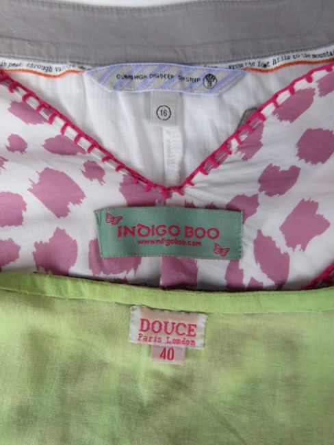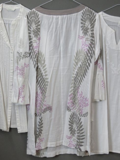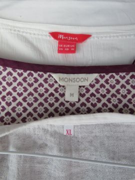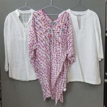 A quantity of assorted ladies shirts and blouses inc sequined covers, Windsmoor shirt, Monsoon items. UK approx size 14-16. Also two summer dresses. Twenty-one items.