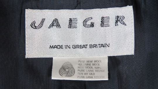 Jaeger; A navy blue 100% new pure wool jacket and skirt, jacket having breast pockets and epaulets, both UK size 14. Approx measurements; jacket - 42" chest, 33 1/4" length at back inc collar, 16 3/4" sleeve length underarm. Skirt - 24" length, 30" waist.