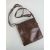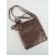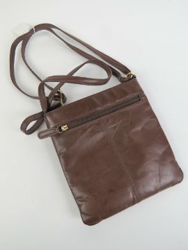 A brown leather handbag with label for Alpha 8" deep, 7.5" wide.