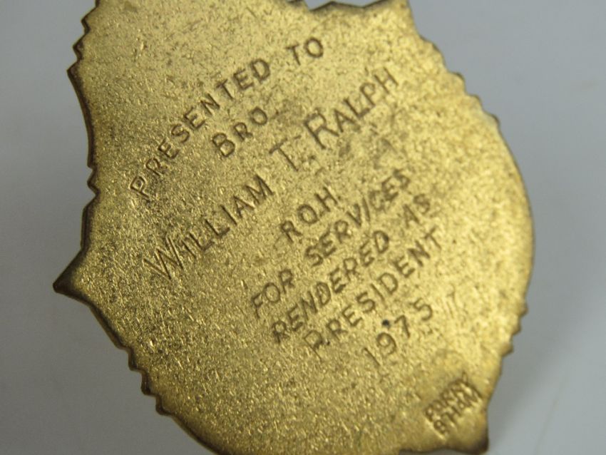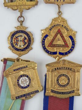The Royal Antediluvian Order of Buffaloes (RAOB); a 1951 President jewel medal with ribbon presented to Bro. J Jennings CP. Together with three other President jewel medals by Parry Birmingham, with ribbons, c1975-1989 being; Newbury & District, Wharfdale ROH Assembly No75, and Bradford Knights Chapter. Four items.