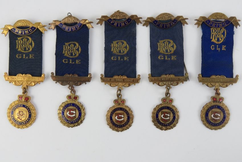 The Royal Antediluvian Order of Buffaloes (RAOB); five Primo GLE jewel medals c1941-1948 being; Sir Tom Wilby Lodge No4240, Primrose Lodge No917, Sir Henry Pearce Lodge No30, Blidworth Glen Lodge No5498, and True As Steel Lodge No27.