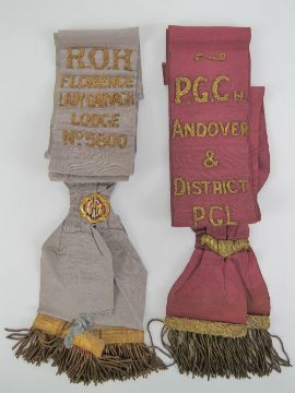 The Royal Antediluvian Order of Buffaloes (RAOB); An ROH Florence Lady Garaugh Lodge No5800 sash made by H Slingsby, together with a purple PGCh Andover & District PGL sash made by F C Parry. Two items.