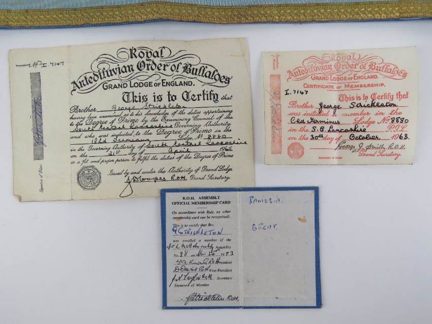 The Royal Antediluvian Order of Buffaloes (RAOB); A collection of regalia for Bro.George Strickleton of Old Terminus Lodge No.8880 including ROH lambskin apron, sash made by Fattorini & Sons, collar with jewel and Roll of Honour bars upon, cuffs made by Fattorini & Sons, Certificate of Membership dated 1963, Degree of Primo dated 1965 and official membership card dated 1973. Seven items.