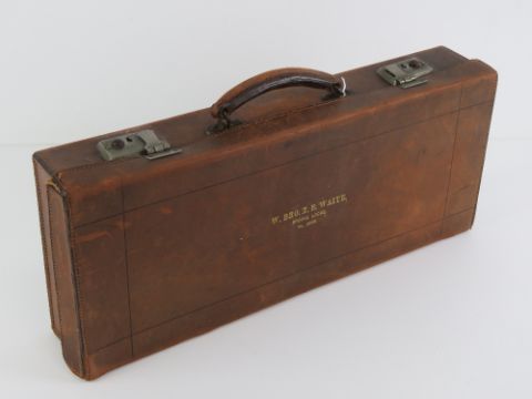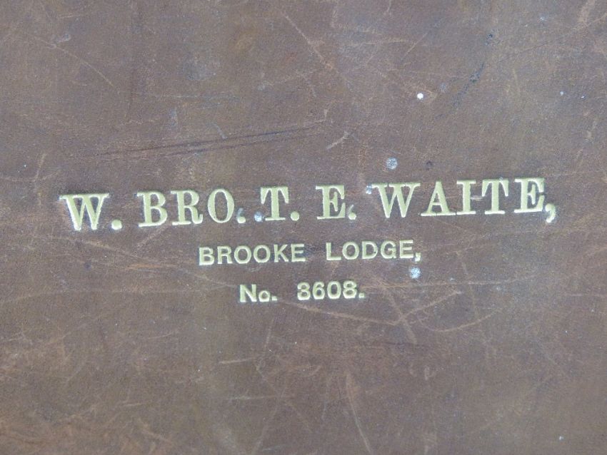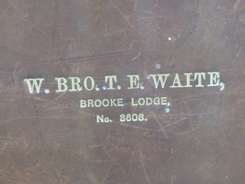 Masonic; A leather regalia case presented to W.Bro.T.E.Waite upon his taking provincial rank, containing his collar and collar jewel, jewel made by Henning & Son London, cuffs and apron.
