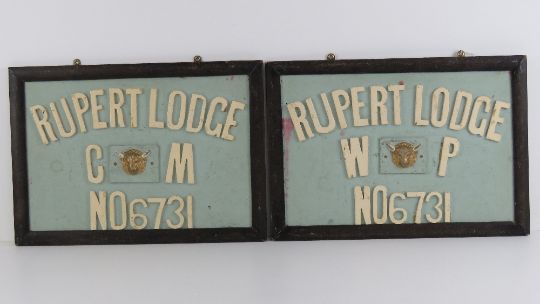 The Royal Antediluvian Order of Buffaloes (RAOB); A pair of Rupert Lodge 6731 signs for the WP and the CN, each measuring 44.5 x 31cm. Provenance: From the collection of a member of various lodges since 1980s.