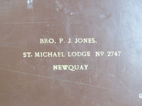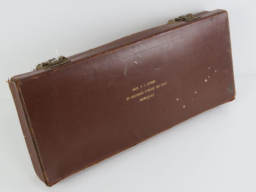 Masonic; a leather regalia case for Bro. P J Jones, St Michael lodge no 2747 Newquay, containing black silk bow tie, another bow tie, three rosettes and three pairs of white gloves.