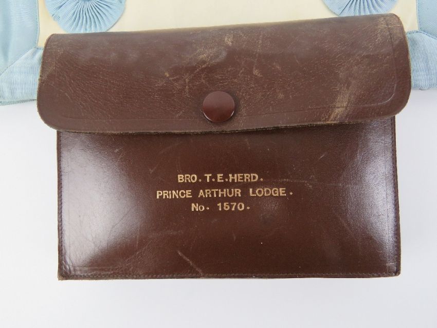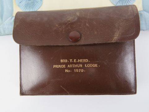 Masonic; Two leather regalia pouches each containing a lambskin apron, marked respectively for Bro. C Kendrick, Marlborough Lodge No.1620 and Bro. T E Herd, Prince Arthur Lodge No.1570.