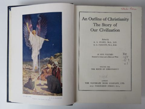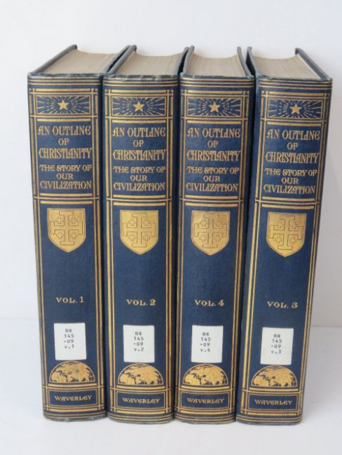 Books; An Outline of Christianity, the story of our civilisation. Four of five volumes edited by Peake & Parsons. Cloth full bound. Published by The Waverley Book Co London 1926. Ex-Libris Cathedral and Abbey of St Alban.