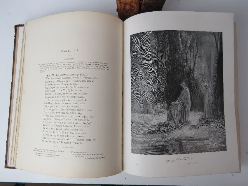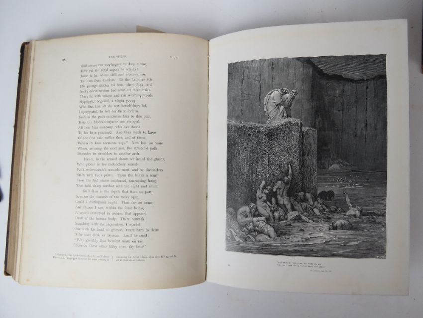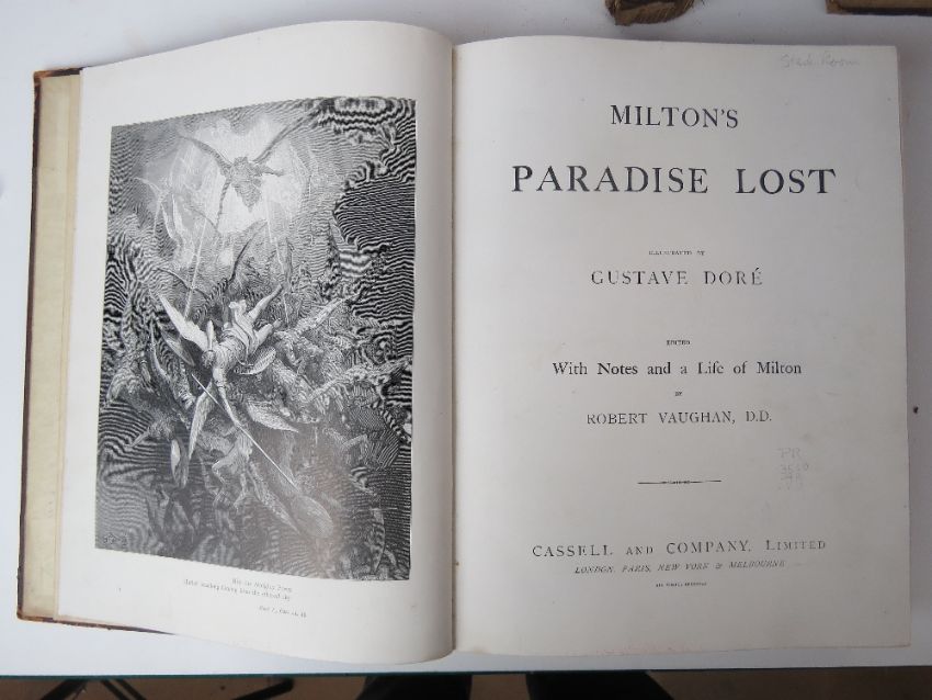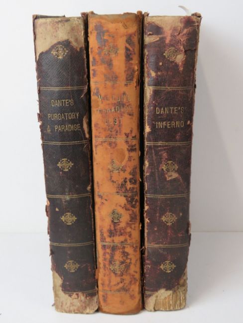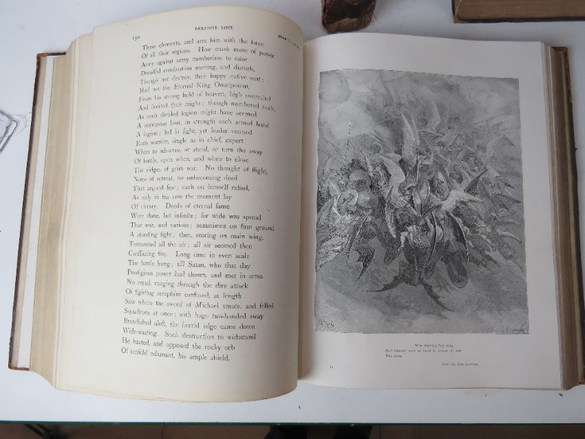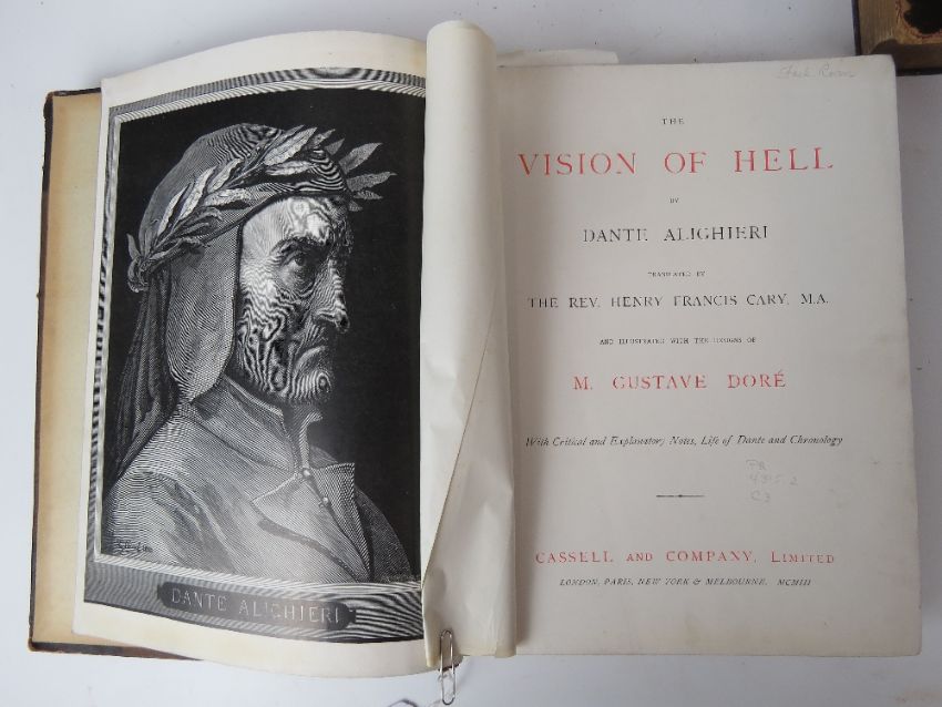 Books; Milton's Paradise Lost illustrated by Gustav Dore. Leather half bound. Published by Cassell & Co 1905. Together with The Vision of Purgatory and Paradise by Dante Alighieri, leather half bound. Also The Vision of Hell by Dante Alighieri translated by Rev Henry Francis, leather half bound. Three items. Ex-Libris Cathedral and Abbey of St Alban.