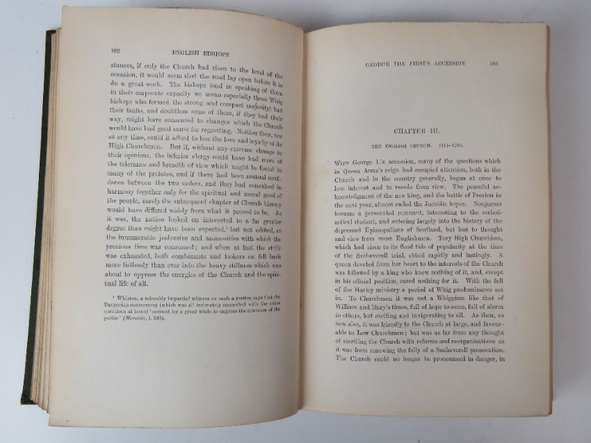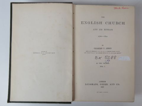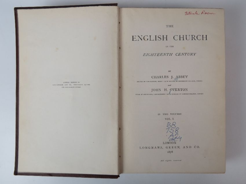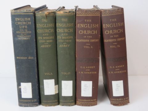 Books; English Church Life from 1660-1833 by J Wickham Legg. Cloth full bound. Published by Longmans, Green & Co London 1914. Together with The English Church and its Bishops 1700-1800 in two volumes by Charles Abbey. Cloth full bound. Also The English Church in the 18th Century. In two volumes. Cloth full bound. Five items. Ex-Libris Cathedral and Abbey of St Alban.