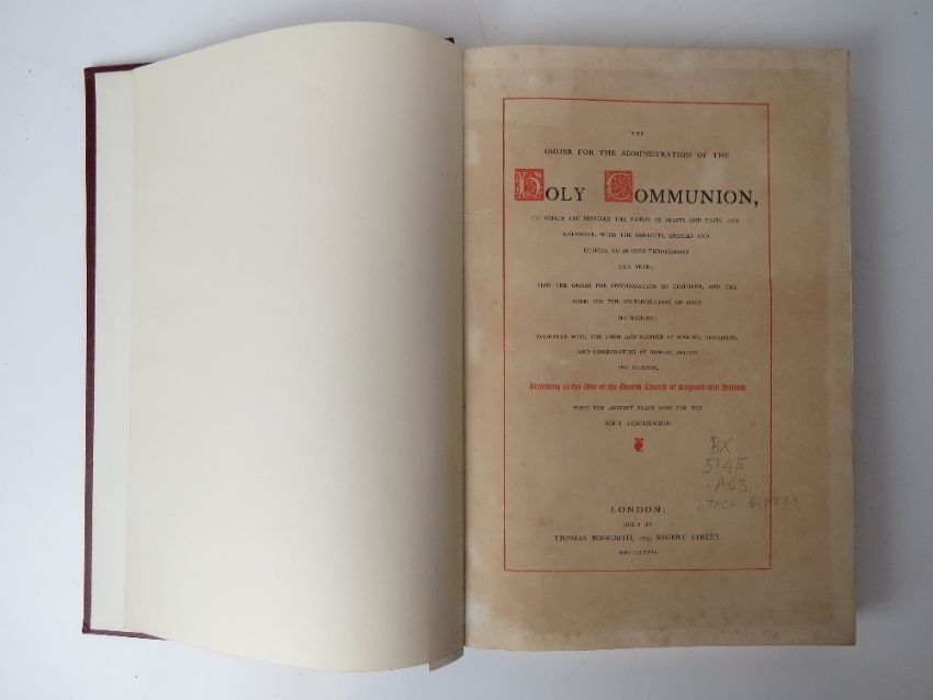 Book; The Order for the Administration of Holy Communion. Edited by the Rev Fredrick Lee London 1867. Cloth full bound. Ex-Libris Cathedral and Abbey of St Alban.