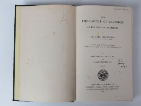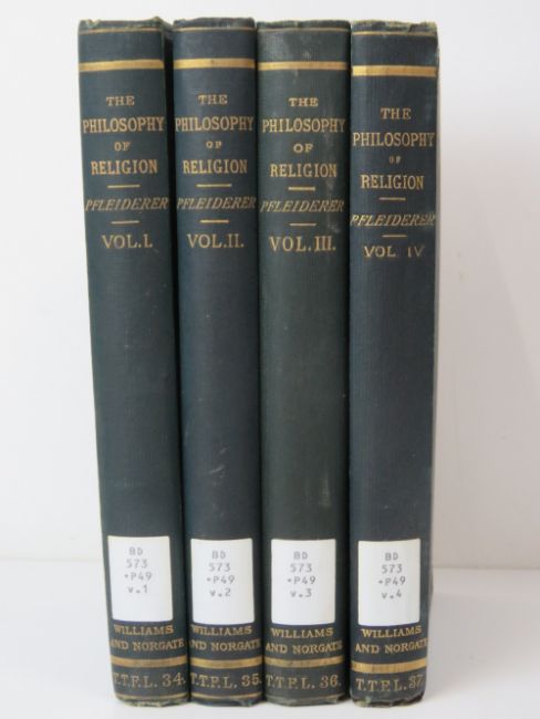Books; The Philosophy of Religion by Dr Otto Pfleiderer. Cloth full bound. In four volumes. Published by Willaims & Norgate London 1886. Ex-Libris Cathedral and Abbey of St Alban.