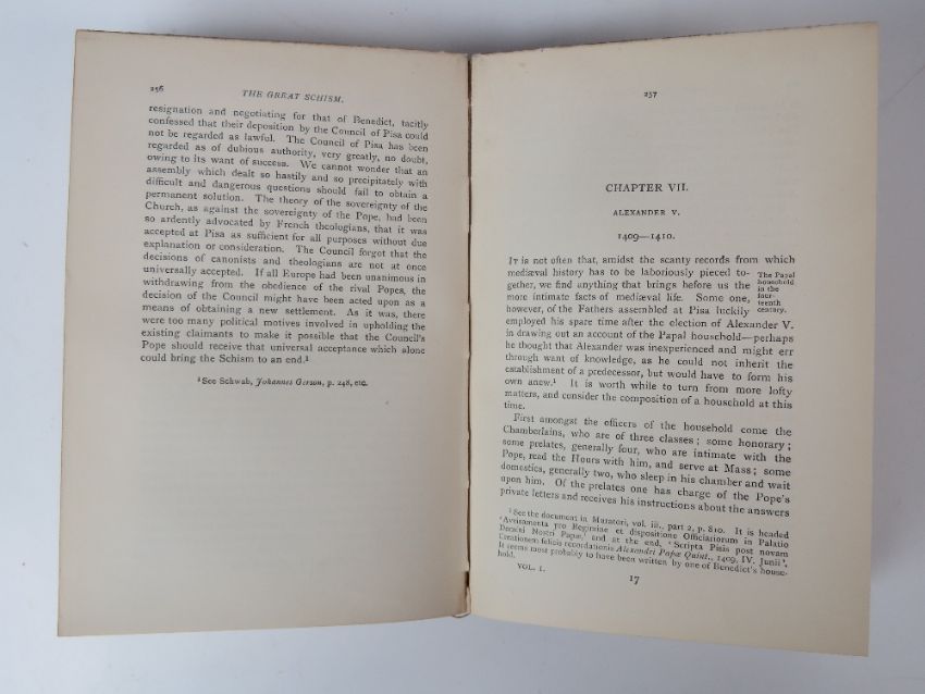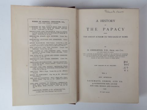 Books; A History of the Papacy from the Great Schism to the Sack of Rome by M Crighton. Cloth full bound in six volumes. Published by Longmans, Green & Co, London 1907. Ex-Libris Cathedral and Abbey of St Alban.