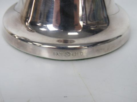 A pair of silver Chrisophersen short candlesticks, Norwegian geometric design having original label to base, each standing 10cm high.