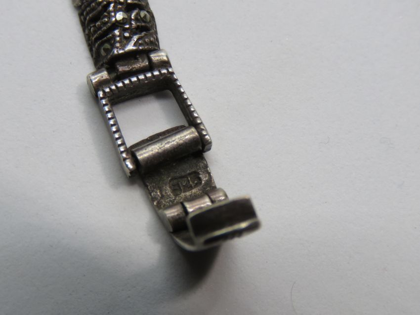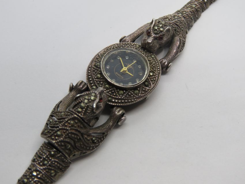 An unusual silver and marcasite encrusted ladies watch in the form of two articulated leopards, stamped 925, Quartz movement.