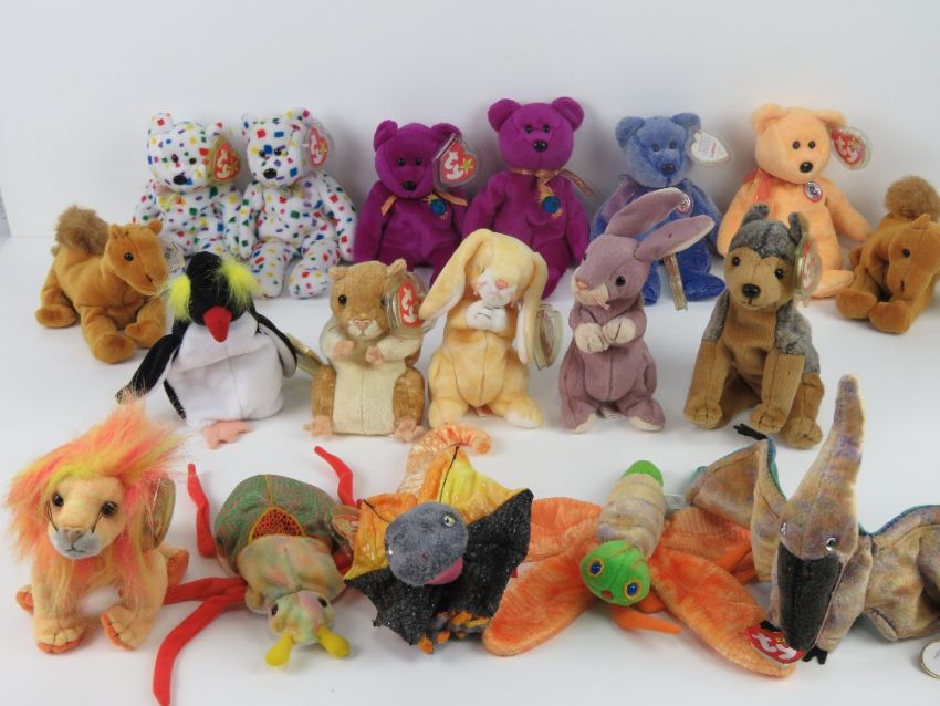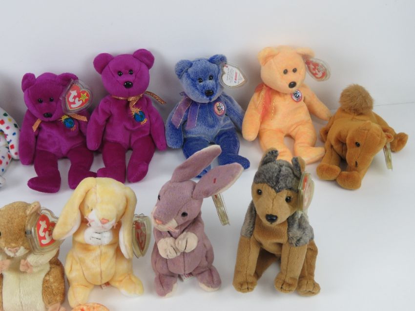 Ty Beanie Babies/Beanie Bears; 'Milennium' (x2, one with tag, one without), 'Ty 2K', (x2 with tags). Together with 2000 edition Beanie Bears/Babies being 'Periwinkle', 'Sunny', 'Niles' (x2), 'Bushy', 'Swoop', 'Slayer', 'Glow', 'Scurry', 'Pellet', 'Sarg', 'Frigid', 'Springy' and 'Grace'. Eighteen items all with tags.