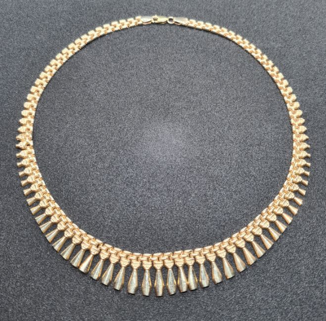 A 9ct gold articulated necklace having three-row panel chain with graduated 'tassles' upon, hallmarked 375 measuring 40.5cm in length and weighing 15.1g.