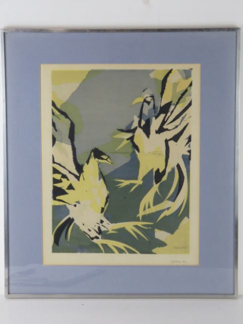 Coloured print; fighting birds entitled 'Veron 62' lower right, 44 x 34cm.