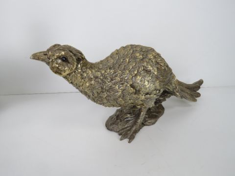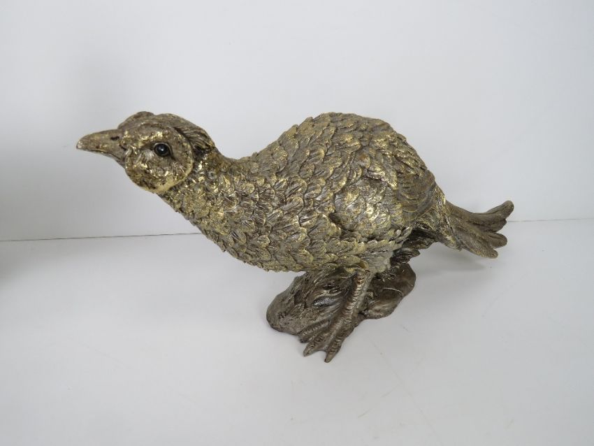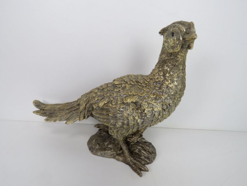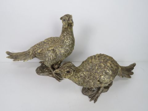 A pair of gold painted pheasant table decorations, one standing 23.5cm high, the other 35cm in length.