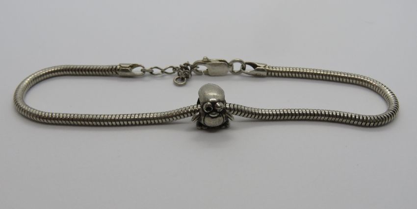 A Pandora style charm bracelet stamped 925 with single charm in the form of a penguin upon, charm stamped Charm Company 925.