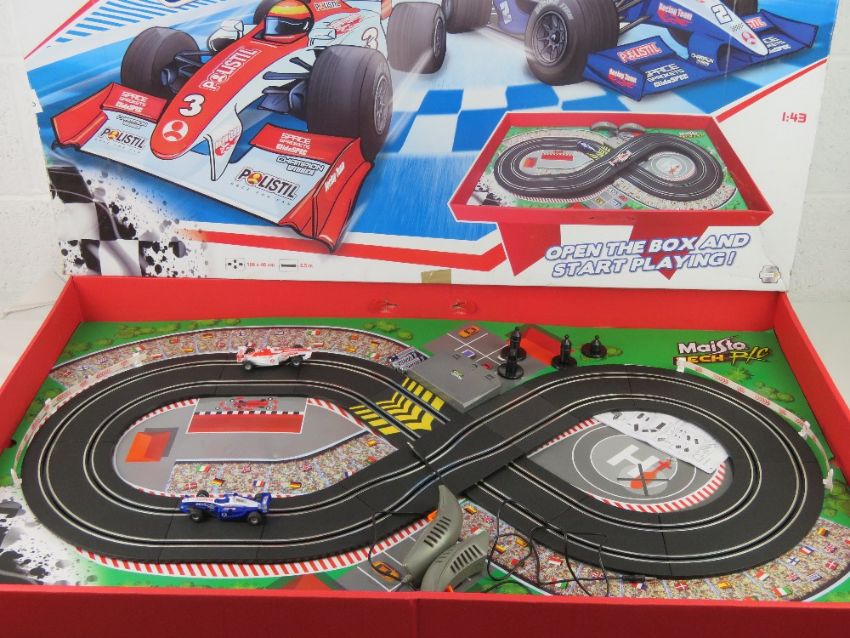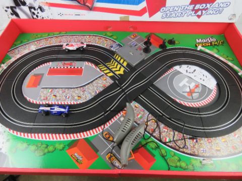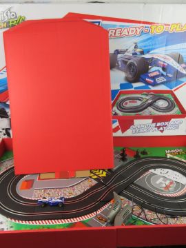 A Miasto Tech r/c My First Slot set, ready to play. Box opening to reveal track, two controllers and two cars.