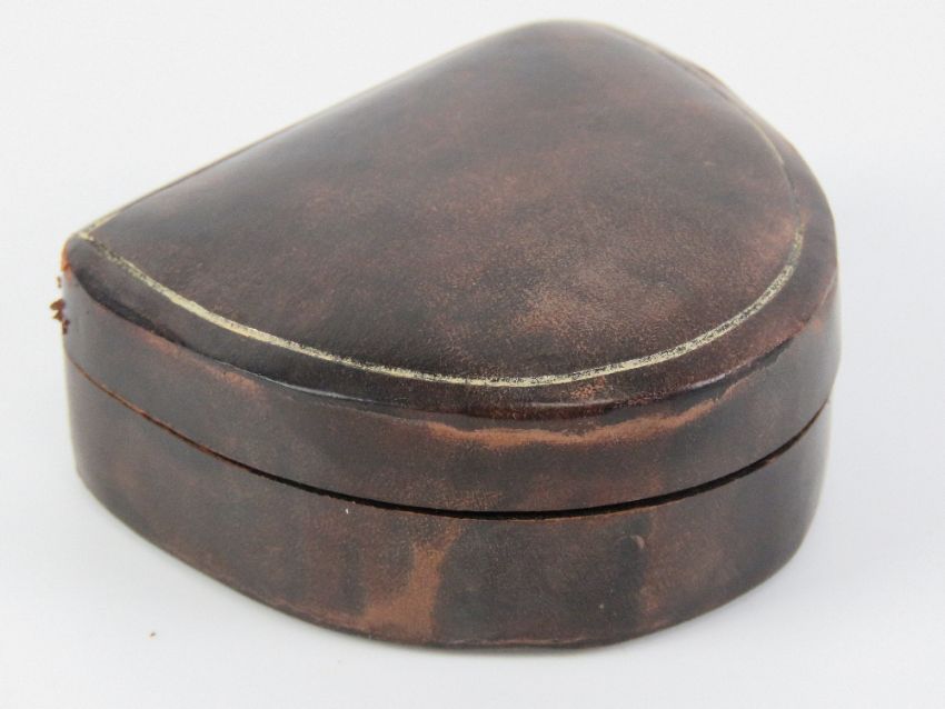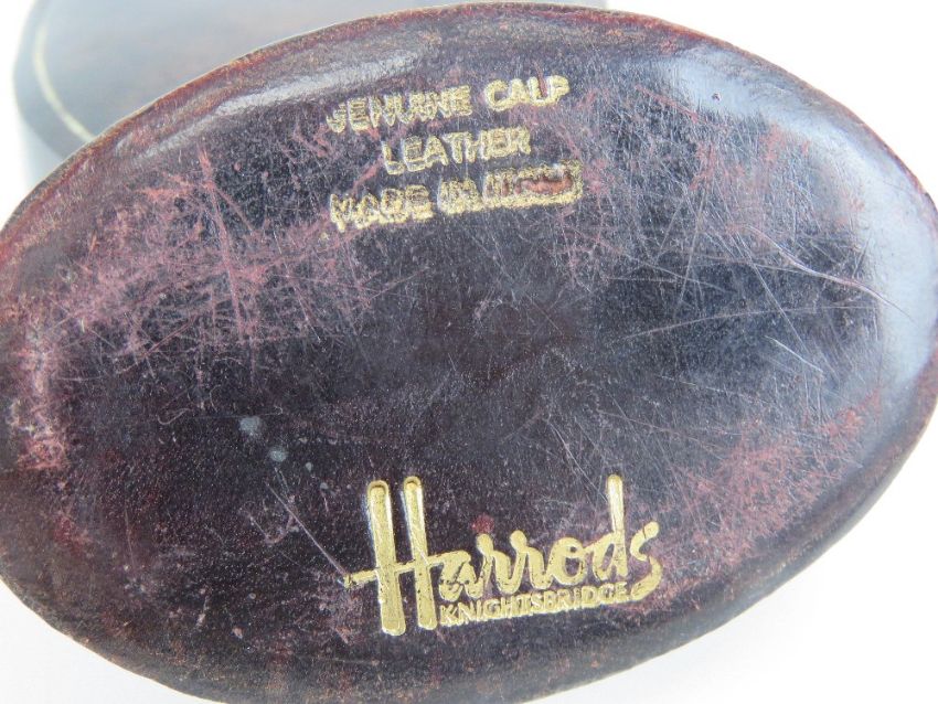 Two leather covered stud boxes manufactured by and stamped Harrods, one horseshoe shaped measuring 6 x 6 x 2.5cm.