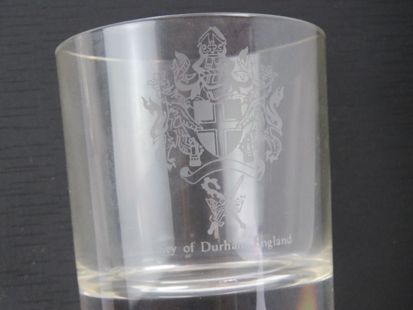 A cut glass decanter with stopper together with an ovalaide glass frilled dish, four pieces of coloured art glass, a pair of tumblers having City of Durham crest etched upon and a lead crystal bowl with flower stem separator. Nine items.