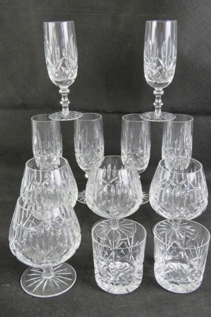 A set of four cut glass brandy balloons, together with a set of six cut glass champagne flutes, and a pair of cut glass tumblers.